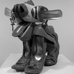 A shoe is a shoe is a shoe. And this high heel shoe that knows the street, the club, the party, the salon, the foot, the walk, the dance, the strut, keeps tab on its memory too. It can see across the Atlantic, perhaps just a bit north of the equator. Present tense. Continuous. The shoe multiplies, bends, shapes, combines. Face. Figure. Ears. Trickster rabbit. Birds. Bad girl ready for anything. Everything is anything. Downtown Goddess. No shoes at all: Bronze, color, patina, finish (2013).[spacer height=”20px”]